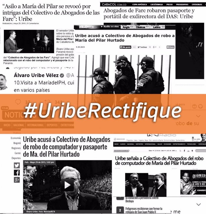 Entonces, Uribe acusó al Colectivo de Abogados de haberse robado el computador y el pasaporte de María del Pilar Hurtado, de “intrigar” contra la exfuncionaria, y lo señaló de ser parte de la guerrilla de las Farc. Estas afirmaciones las hizo en su cuenta de Twitter en repetidas ocasiones. Dos de esos trinos publicados el 29 de mayo de 2015 fueron: