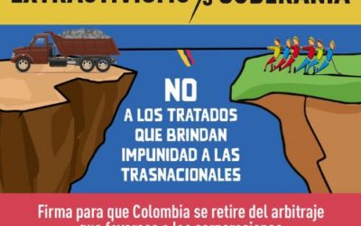 Recuperemos la soberanía de Colombia en defensa del agua, la vida y los territorios FIRMA la solicitud para que el Gobierno se retire de tratados que permiten que Colombia sea … Sigue leyendo Firma la solicitud para que el Gobierno se retire de tratados que permiten que Colombia sea demandada ante tribunales diseñados por y para favorecer a las transnacionales